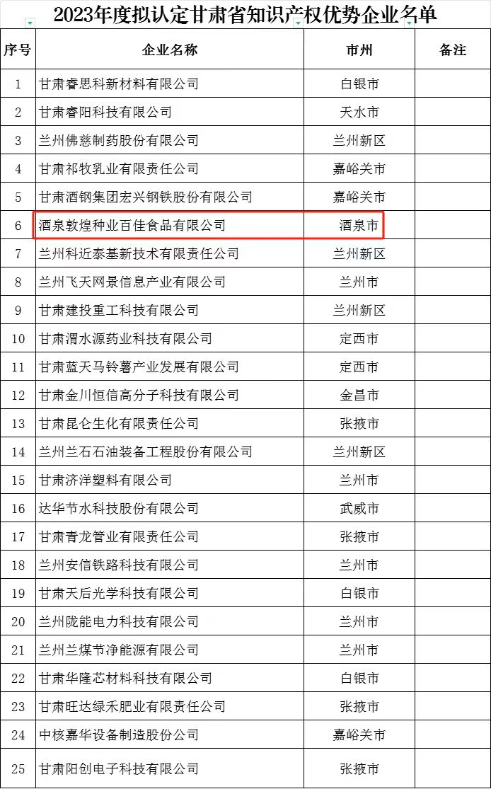 喜訊傳來(lái)!酒泉敦煌種業(yè)百佳食品有限公司榮獲“甘肅省知識(shí)產(chǎn)權(quán)優(yōu)勢(shì)企業(yè)”稱號(hào)